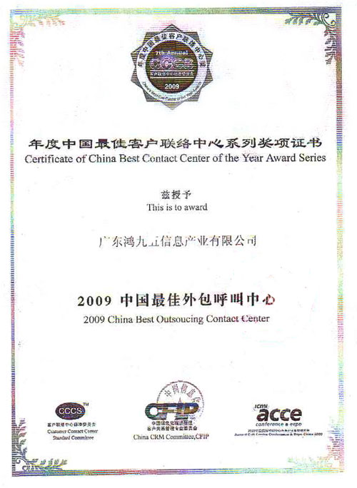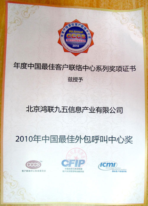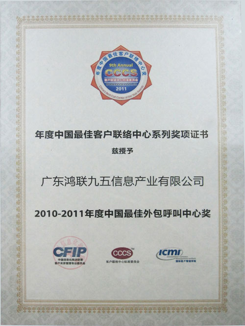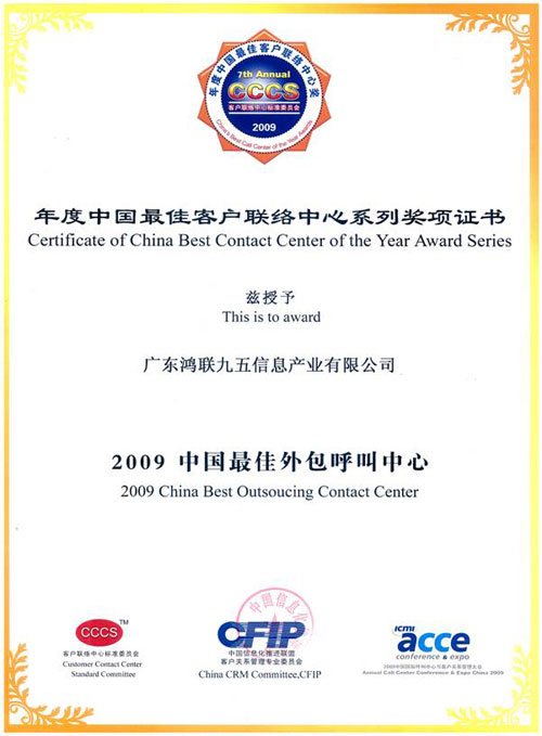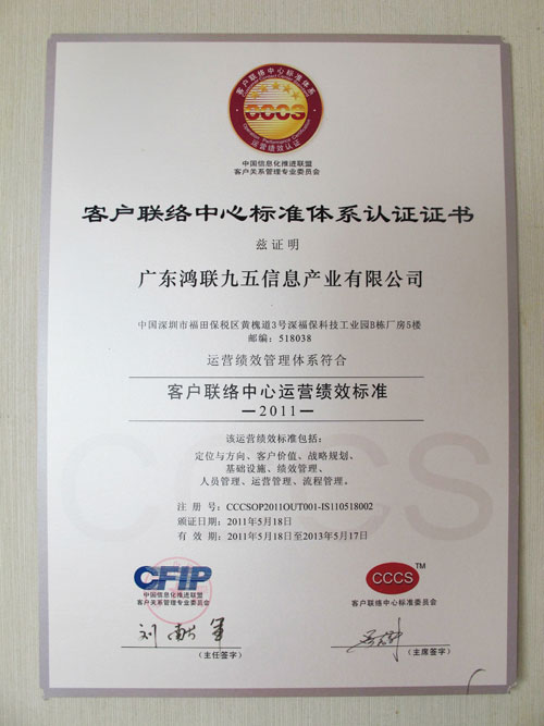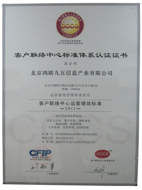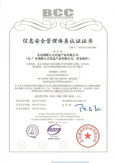 鸿联九五经历多年的运营管理优化,不断的通过各类体系和权威的认证,如 ISO27001 安全管理体系认证、ISO9001 质量管理体系认证、ISO14001 环境管理体系认证、ISO22301业务连续性管理体系认证、ISO27701 隐私信息管理体系认证和 OHSAS18001职业健康安全管理体系认证等。目前已获得行业的认可和肯定,成为通信行业、呼叫协会、人力资源行业的理事单位。连续多年荣获中国最佳外包服务商奖,2017年荣获北京市海淀区中关村质量奖,除此之外,鸿联九五还广泛受到客户的认可与肯定,收到多家合作伙伴的表扬信、优秀供应商奖等。